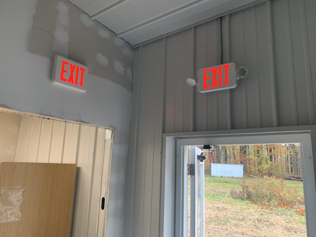 Now completed, the kennel side of the building has lighting zones for each side, a handful of lights intended to stay on overnight to provide some limited lighting, fully equipped emergency lighting and exit signs, and all the switches and panel tie-ins needed to bring it all together.